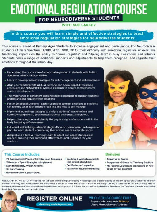 In this course you will learn how to teach Emotional Regulation for Neurodiverse Students (Self-Management & Self-Awareness) in your busy & complex classroom: