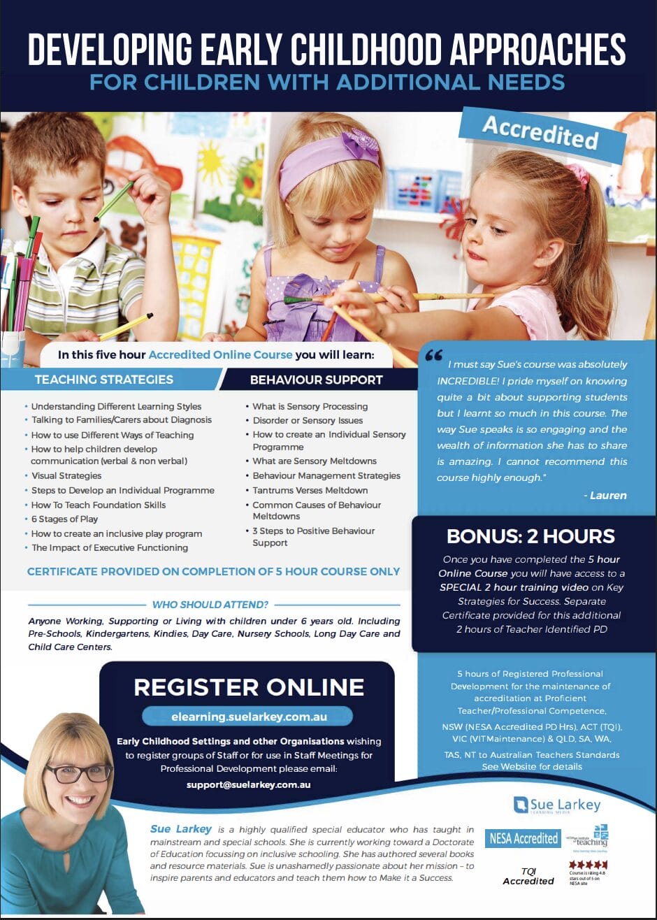 This course was fabulous and I would highly recommend it to other educators of children with ASD. Thanks so much Sue for providing such a valuable resource.”?Kathleen, Teacher“I’m really enjoying the online PD and have lots of ideas that I can take back to my class.” Penny“I am both a Mum to a &yr old with ASD and an English teacher, and feel you really addressed important issues in a practical and informative way. I feel I have many new strategies to try and implement and benefited from the examples you provided. I’m also grateful my son’s teacher and learning support teacher are both doing your webinar too, so together we should be able to make a difference to my son’s learning and engagement with the world” Fiona, Parent“I just finished your course and found it extremely helpful.”“My son’s teacher said it’s the best in- service she has ever had! She has had an epiphany! She understands it all so much better. She has some great ideas for the aide! She feels empowered and inspired! This is so great for all her future students too.”