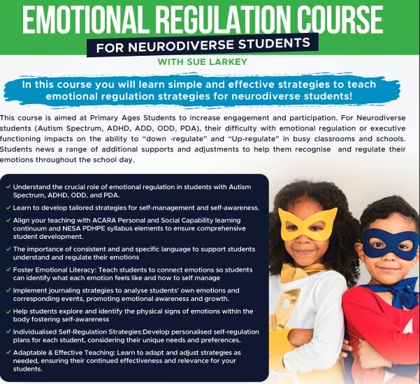 In this course you will learn how to teach Emotional Regulation for Neurodiverse Students (Self-Management & Self-Awareness) in your busy & complex classroom: