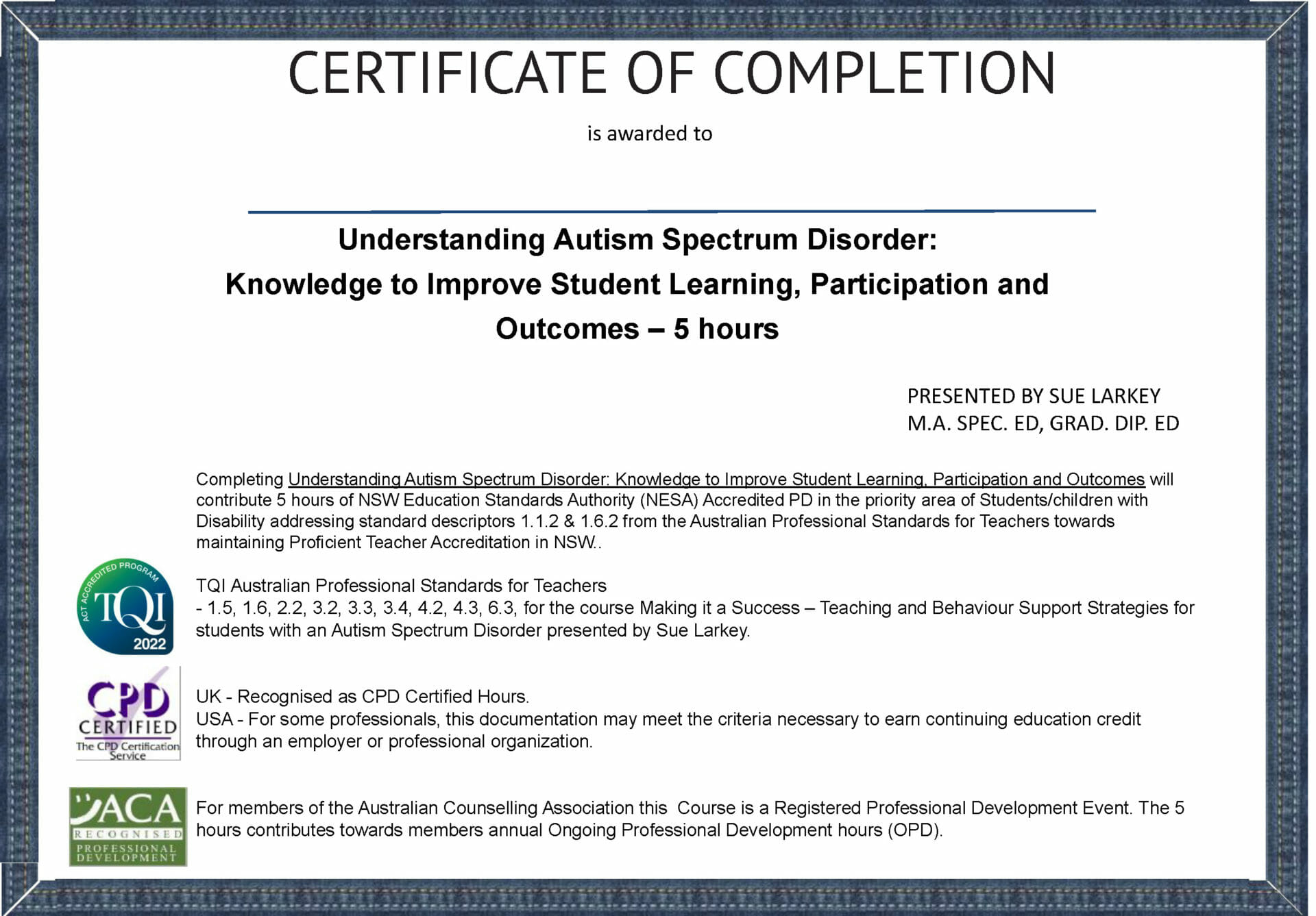 Understanding Autism Spectrum Disorder: Knowledge to Improve Student Learning, Participation and Outcomes – online-on-demand will contribute 5 hours of NSW Education Standards Authority (NESA) Accredited PD in the priority area of Students/children with Disability addressing standard descriptors 1.1.2, 1.6.2 from the Australian Professional Standards for Teachers towards maintaining Proficient Teacher Accreditation in NSW.